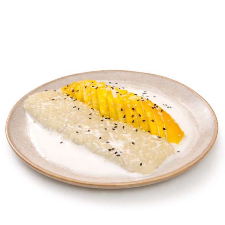 Le mango sticky rice est un dessert traditionnel d'Asie du Sud-Est et d'Asie du Sud fait à base de riz gluant, de mangue fraîche et de lait de coco.