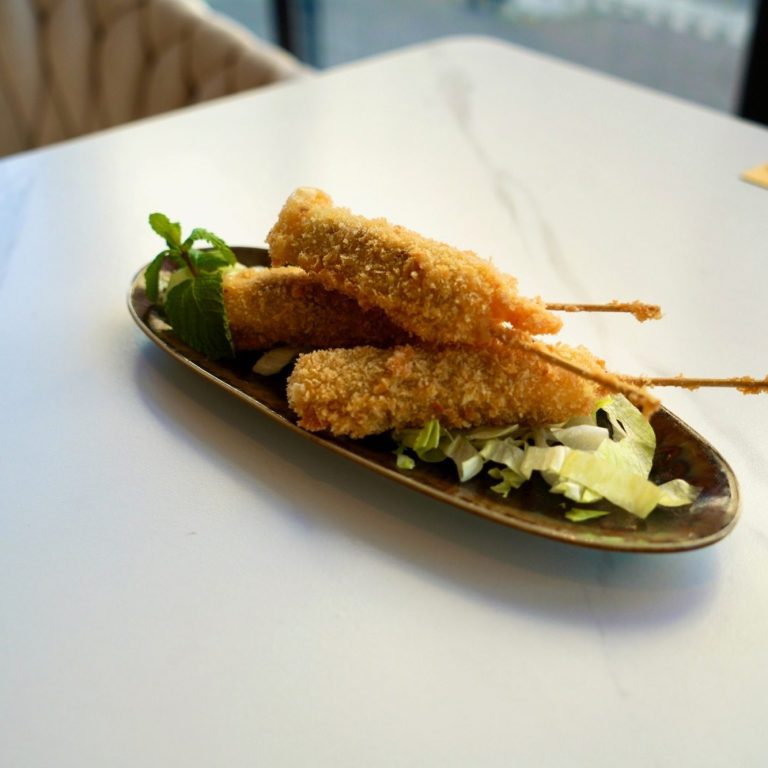 Brochettes de bœuf mariné, garnies de fromage fondant autour d'une panure.