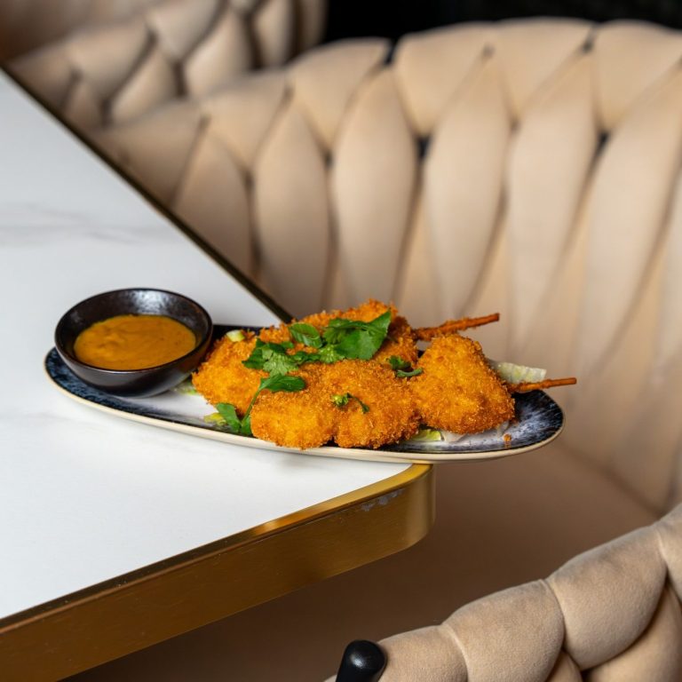 Délicieuses brochettes de poulet marinées et panées accompagnées d'une sauce satay onctueuse à base de cacahuètes
