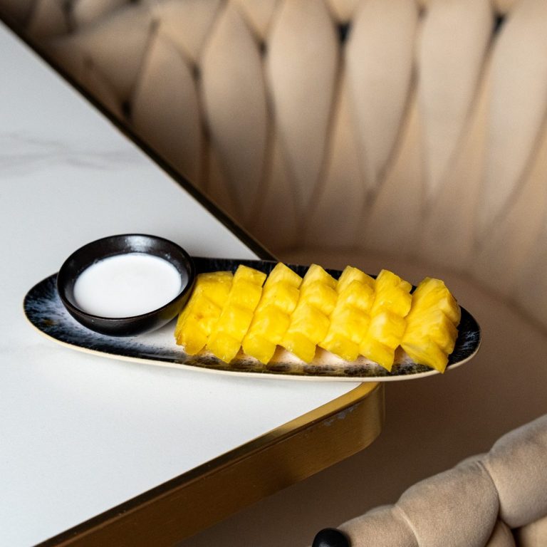 Morceaux d'ananas juteux accompagnée de lait de coco et de caramel.